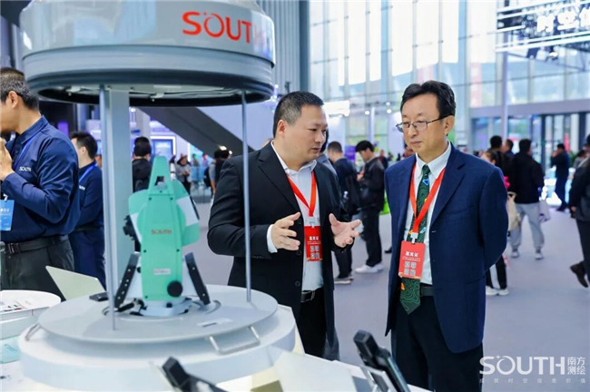自然资源部党组成员、副部长庄少勤在南方展台前驻足停留,对国产全站仪桂冠之作——NT10机器人颇为关注,仔细询问了NT10在各行业领域的应用情况,对南方测绘的国产化之路表示肯定。庄副部长还关切了集团海外市场布局规划,以及光电仪器、激光产品的核心技术优势与热销产品的全球市场竞争力,鼓励南方立足优势,稳健发展。